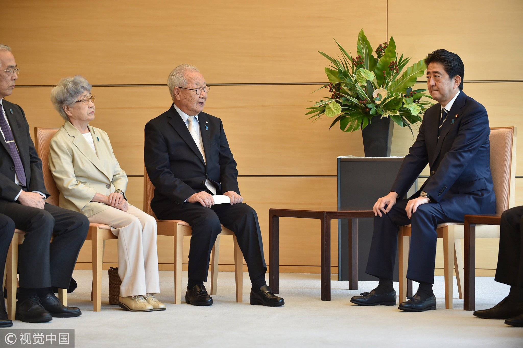 Japan's Prime Minister Shinzo Abe (R) meets family members of victims abducted to the DPRK at the Prime Minister's official residence in Tokyo, Japan, June 14, 2018. /VCG Photo