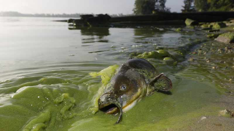 (Top image: A catfish appears on the shoreline in the algae-filled waters of North Toledo, Ohio, US, Sept. 20, 2017. /AP Photo )