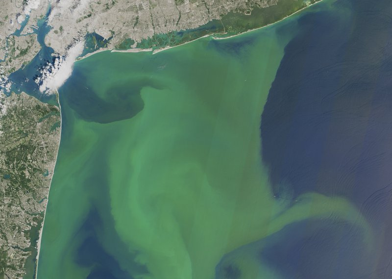 This August 2015 file handout NASA satellite photo shows a large bloom of phytoplankton off the New York, top, and New Jersey, left, coast. /AP Photo