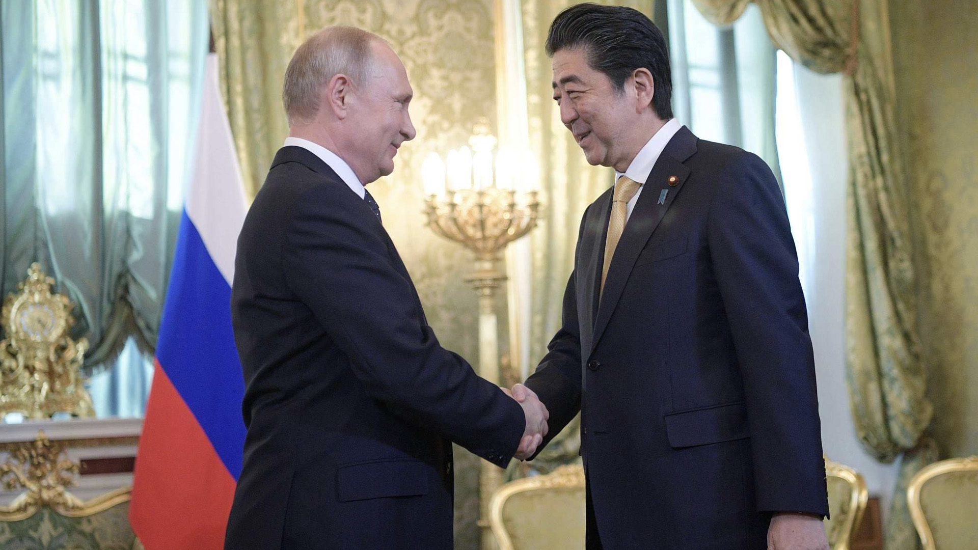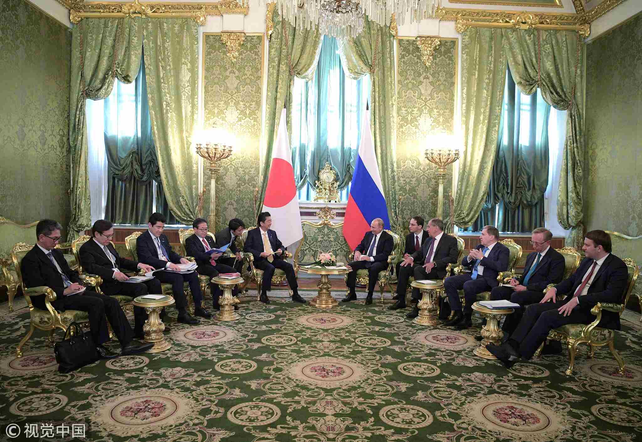 Russian President Vladimir Putin and Japanese Prime Minister Shinzo Abe, center left, during their meeting at the Kremlin in Moscow on May 26, 2018. /VCG Photo