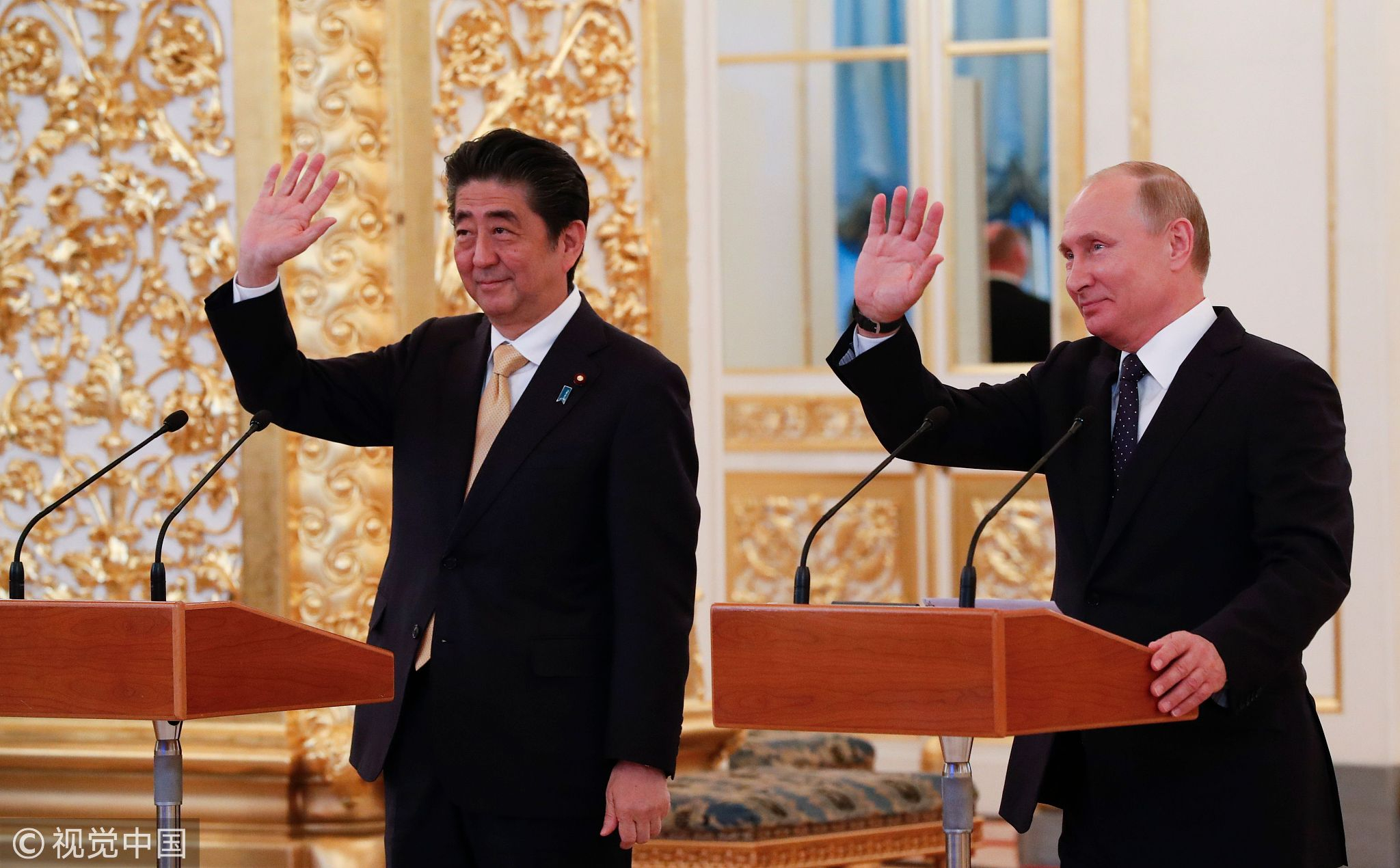 Russian President Vladimir Putin (R) and Japanese Prime Minister Shinzo Abe give a press conference after their meeting at the Kremlin in Moscow on May 26, 2018. /VCG Photo