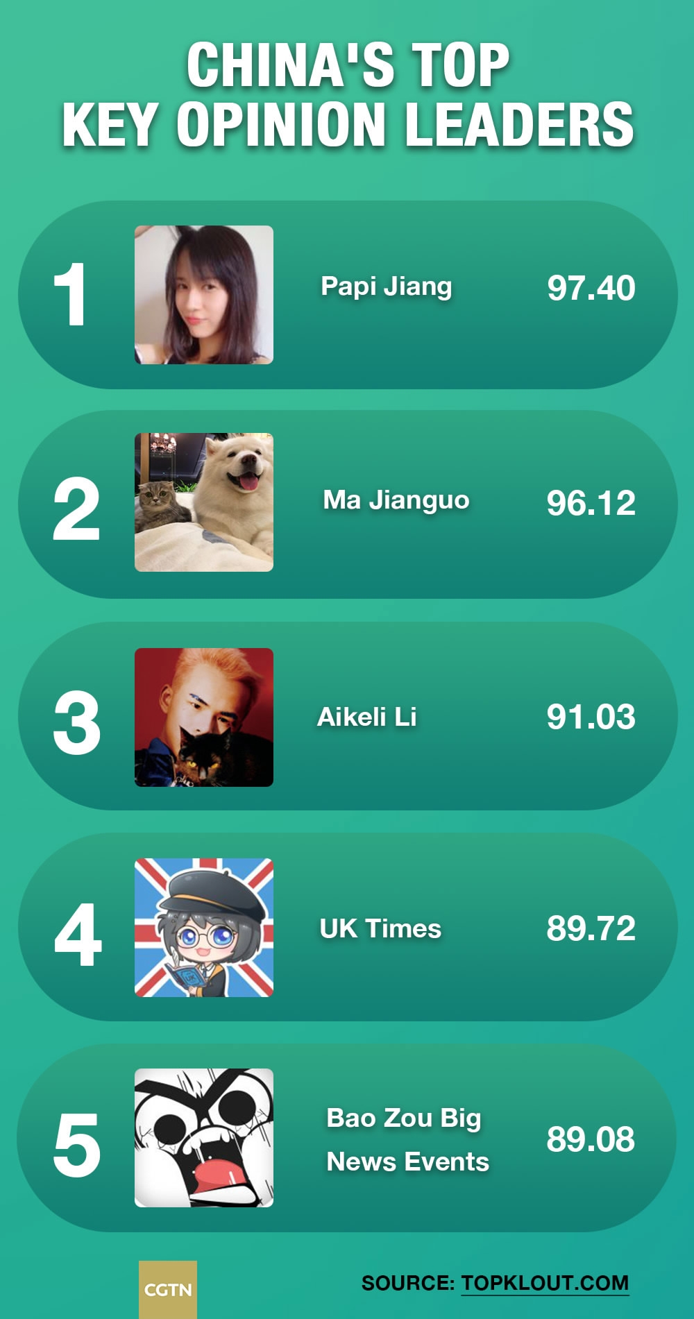 The Chinese website topklout.com has created an index of the most influential KOLs with these five social media stars heading their “TOP100 Red List."
