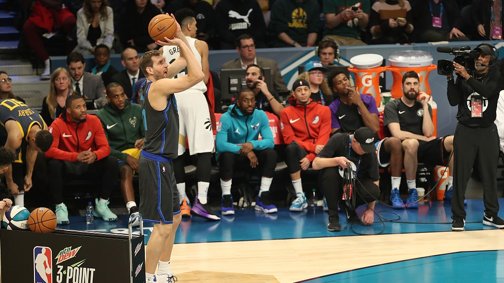 Dirk Nowitzki shoots in the 2019 NBA All-Star Three-Point Contest, February 16. /VCG Photo