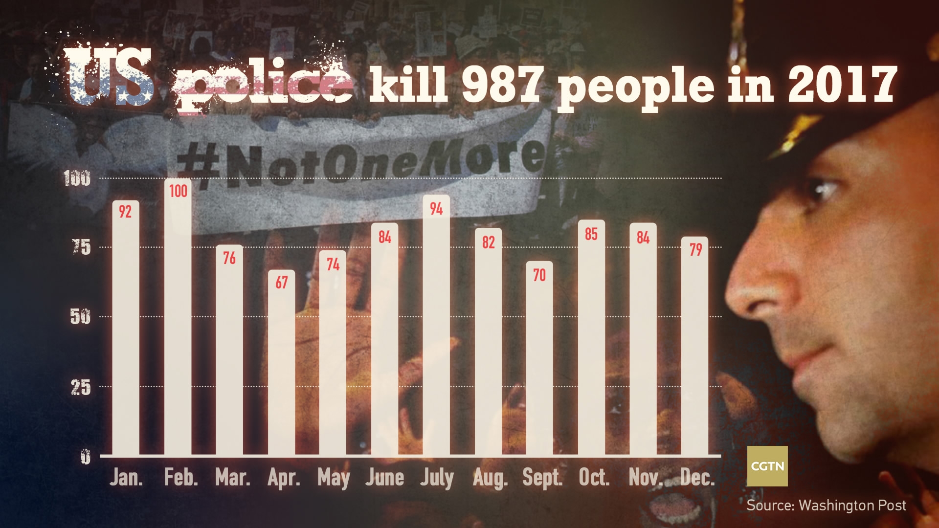 According to the Washington Post, police in the US shot 987 people dead in 2017, and the Guardian reported that, in 2016, black males aged 15-34 were nine times more likely to be killed by police officers than other Americans.
