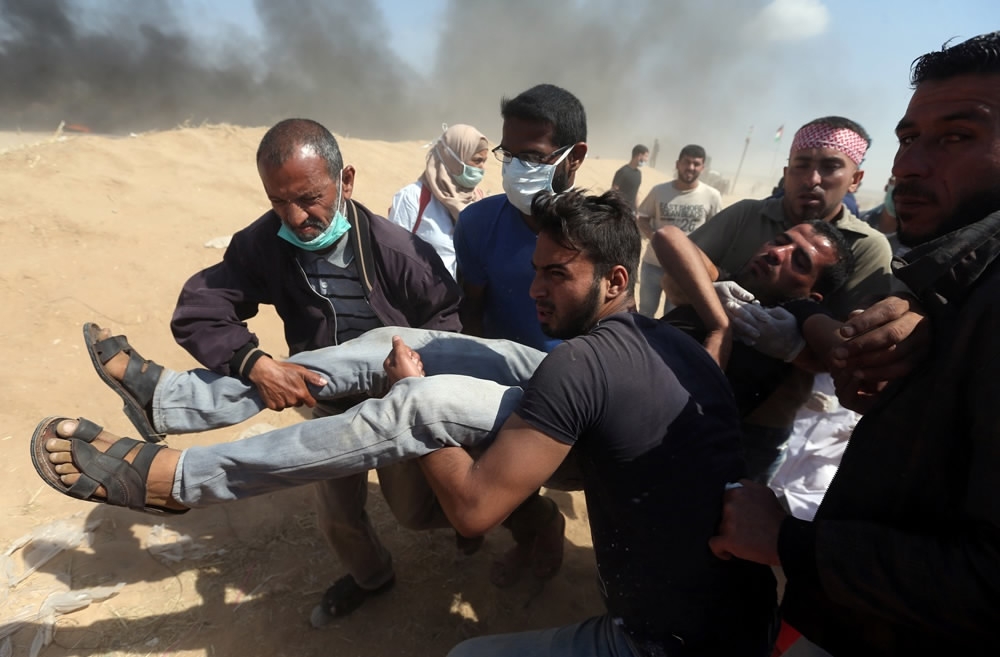 A wounded Palestinian demonstrator is evacuated during a protest at the Israel-Gaza border in the southern Gaza Strip, May 15, 2018. /Reuters Photo