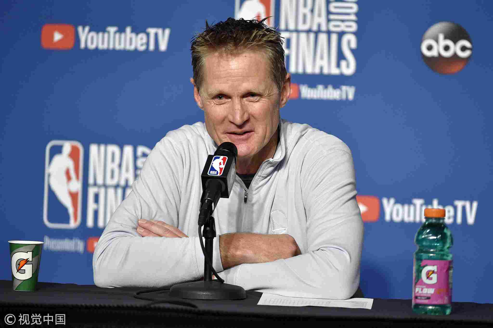 Coach Steve Kerr of the Golden State Warriors speaks with the press after the game against the Cleveland Cavaliers in Game Four of the 2018 NBA Finals on June 8, 2018 at Quicken Loans Arena in Cleveland, Ohio. /VCG Photo
