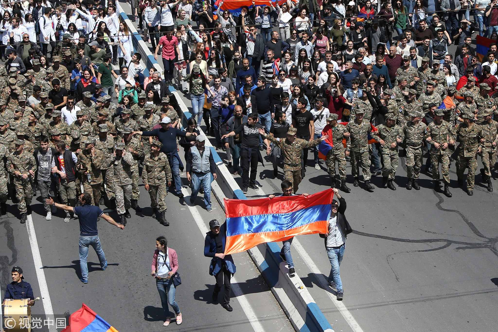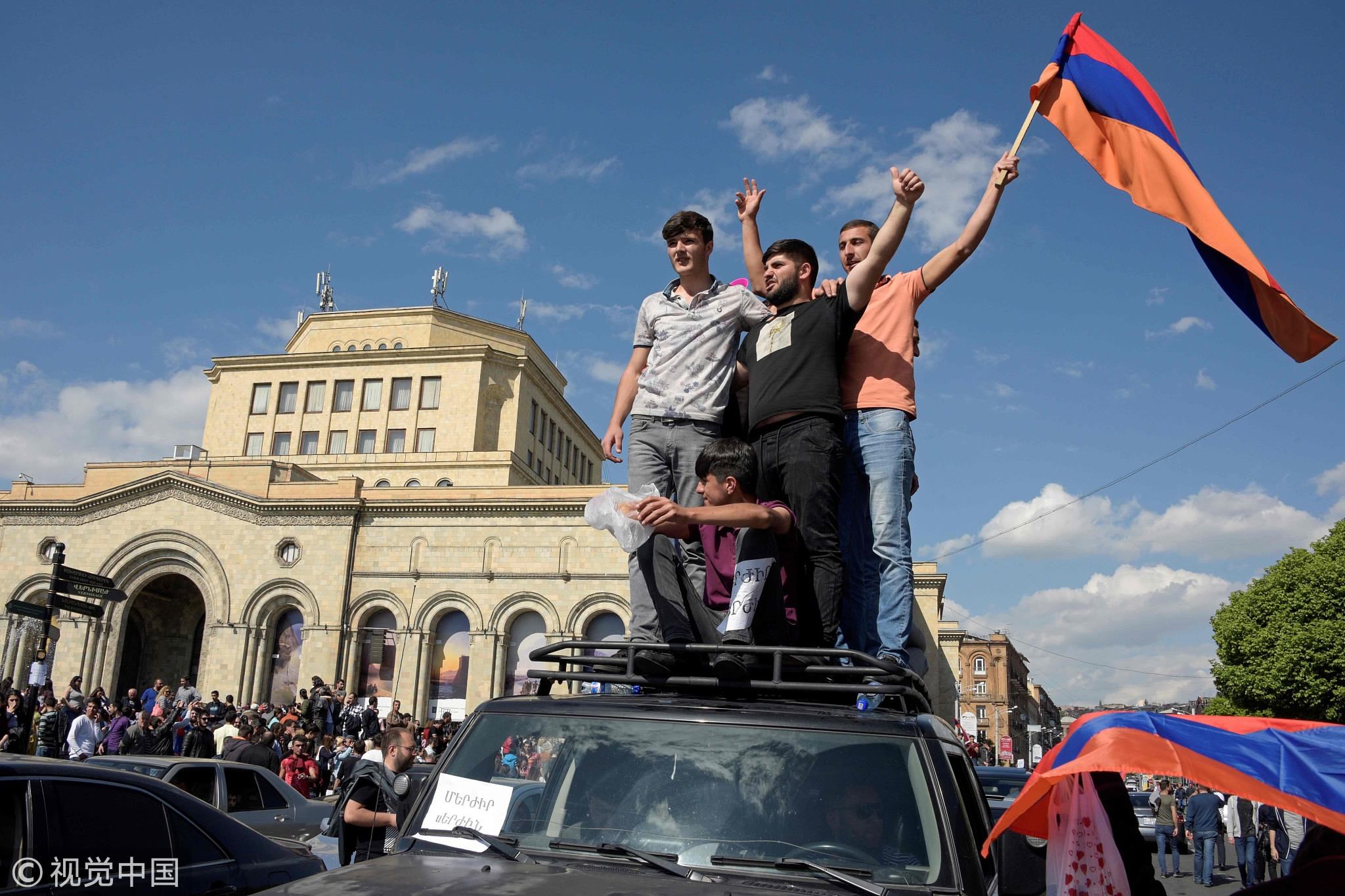 People take part in a protest against the election of ex-President Serzh Sargsyan as the Prime Minister by the National Assembly of Armenia April 23, 2018 in Yerevan, Armenia. /VCG Photo