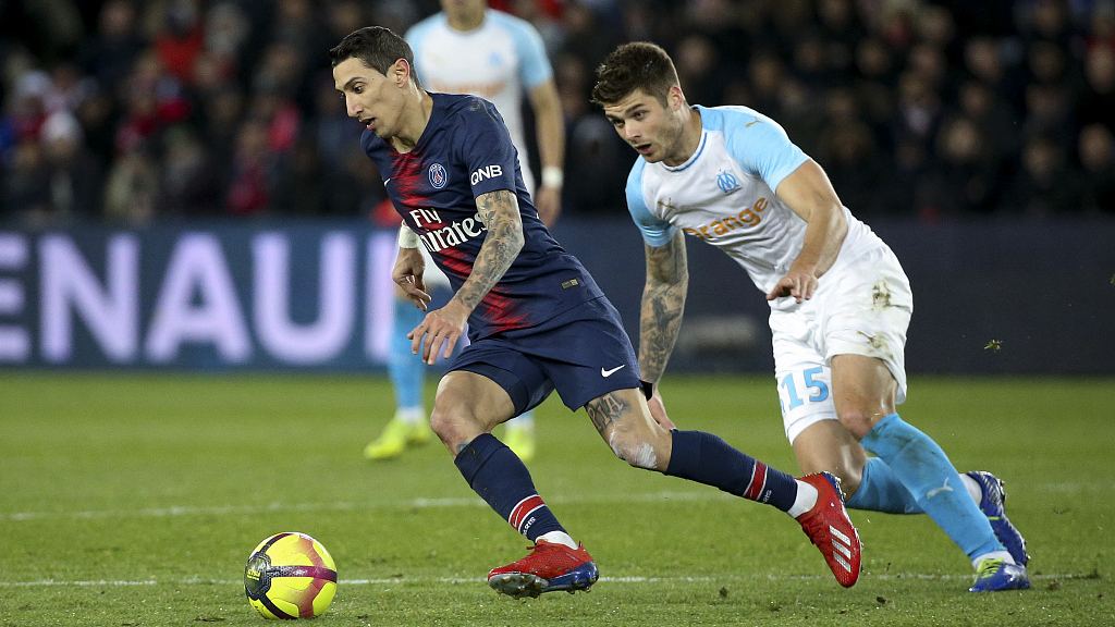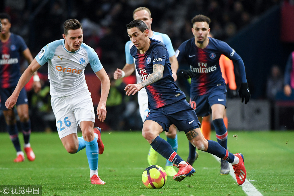 Florian Thauvin of Marseille and Angel Di Maria of PSG compete for the ball during the Ligue 1 match at Parc des Princes in Paris, France, March 17, 2019. /VCG Photo