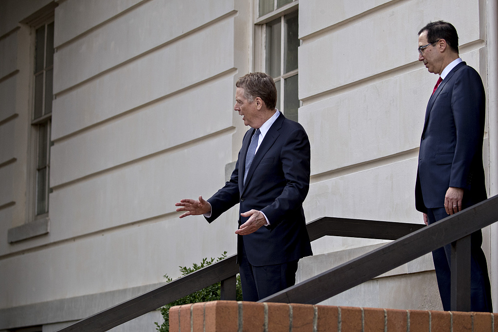 Robert Lighthizer, the U.S. trade representative (left), and Steven Mnuchin, U.S. treasury secretary, wait to greet Liu He, China's vice premier, outside the Office of the U.S. Trade Representative in Washington, D.C., U.S., May 9, 2019. /VCG Photo