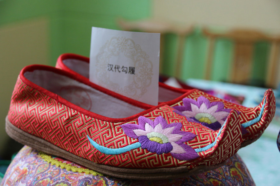 This pair of shoes by Wang Guanqin features the pattern popular during the Han Dynasty (206 B.C.-AD 220). /Chinadaily Photo