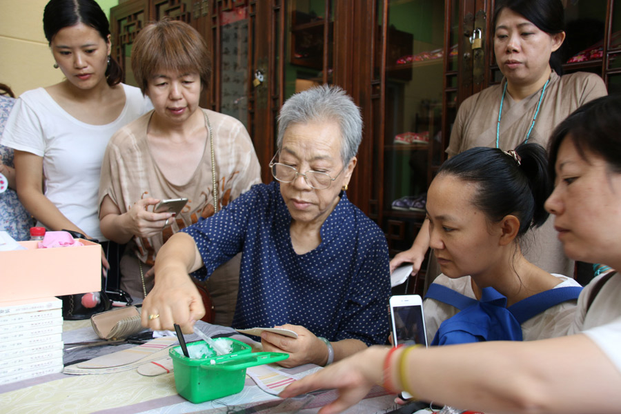 Ten enthusiasts of traditional Chinese embroidery are lucky enough to have a chance of working under the guidance of shoemaking master Wang Guanqin in Beijing.