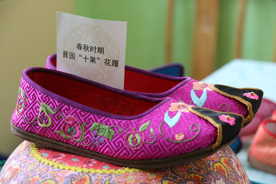 Traditional Chinese handmade shoes by Wang Guanqin, featuring patterns of 10 kinds of fruits, popular during the Spring and Autumn Period (770-476 BC). /Chinadaily Photo