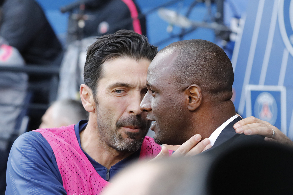 PSG's Gianluigi Buffon greets Nice's coach Patrick Vieira during the Ligue 1 match between the two teams in Parc des Princes, France, May 4, 2019. /VCG Photo