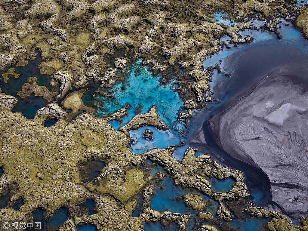 Stunning aerial photos show a landscape in Iceland of green and blue hues created from melting glaciers, which form many small lakes on the field. /VCG Photo