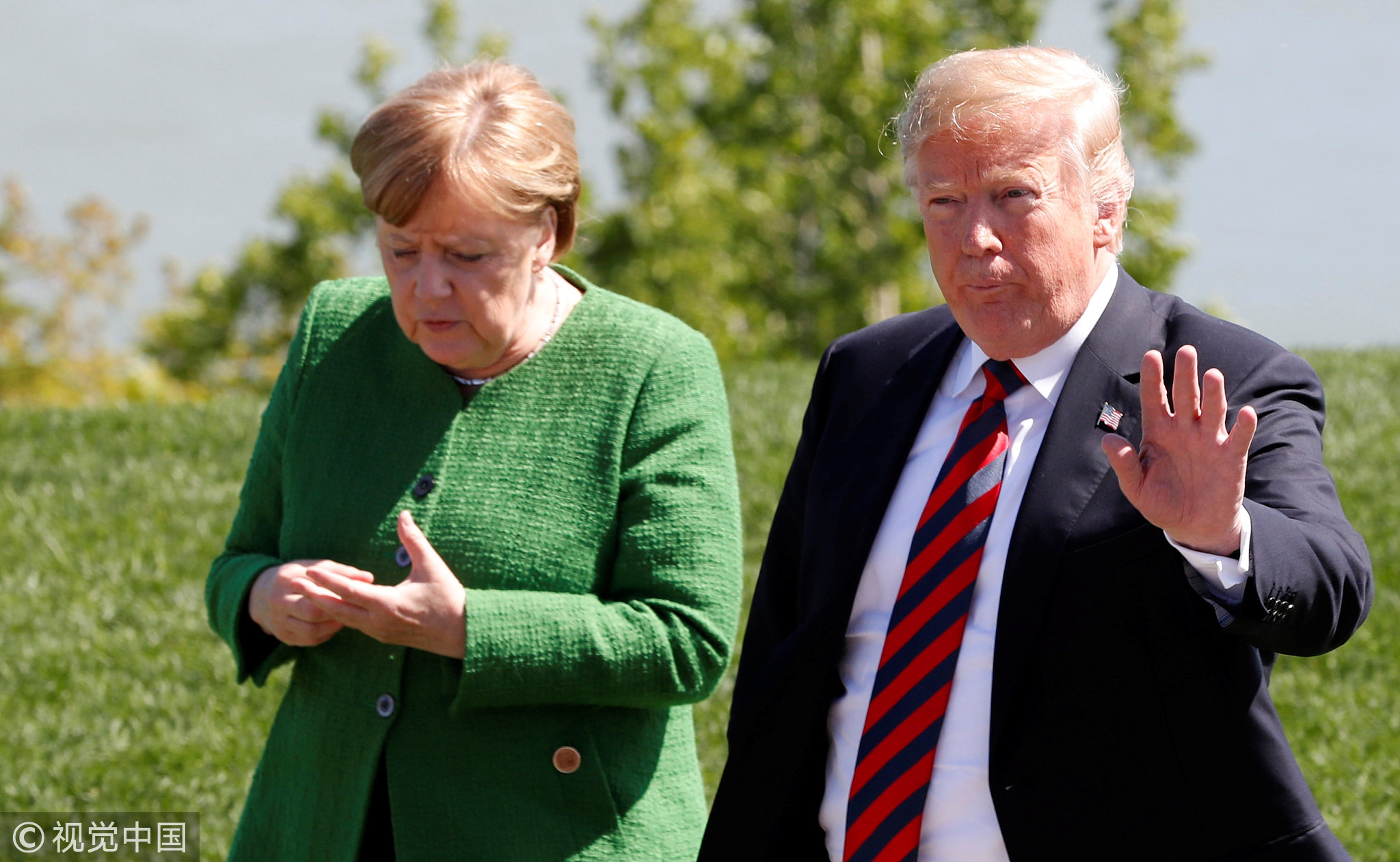 German Chancellor Angela Merkel stands next to US President Donald Trump while posing with other leaders (not pictured) for a family photo at the G7 Summit in Quebec, Canada, June 8, 2018. /VCG Photo