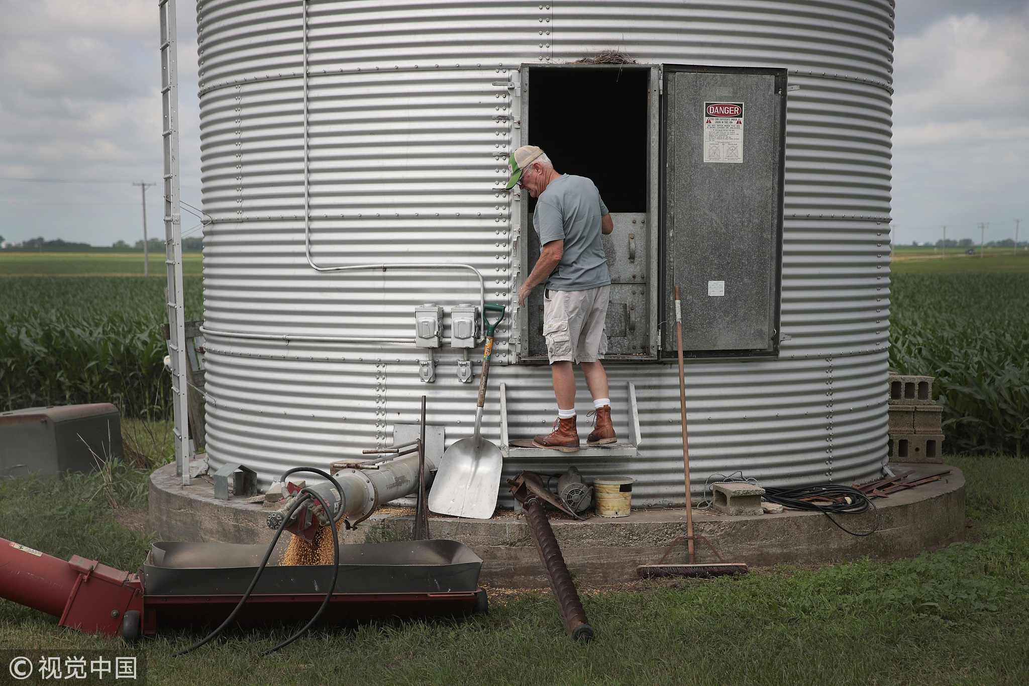 Farmer John Duffy loads soybeans from his grain bin onto a truck before taking them to a grain elevator on June 13, 2018 in Dwight, Illinois, US. /VCG Photo