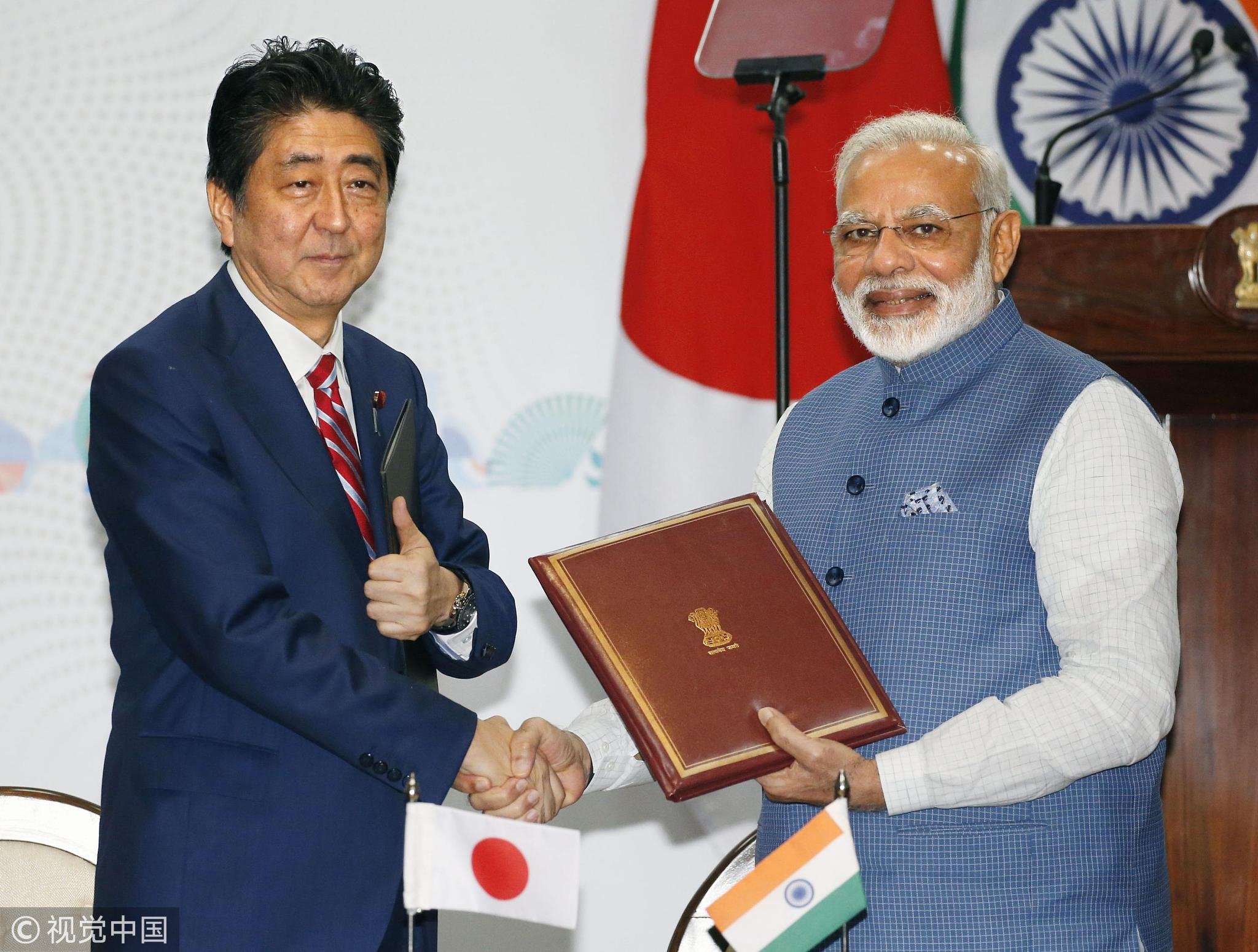 Japanese Prime Minister Shinzo Abe (L) and Indian Prime Minister Narendra Modi shake hands during a news conference in Gandhinagar, western India, on Sept. 14, 2017. /VCG Photo