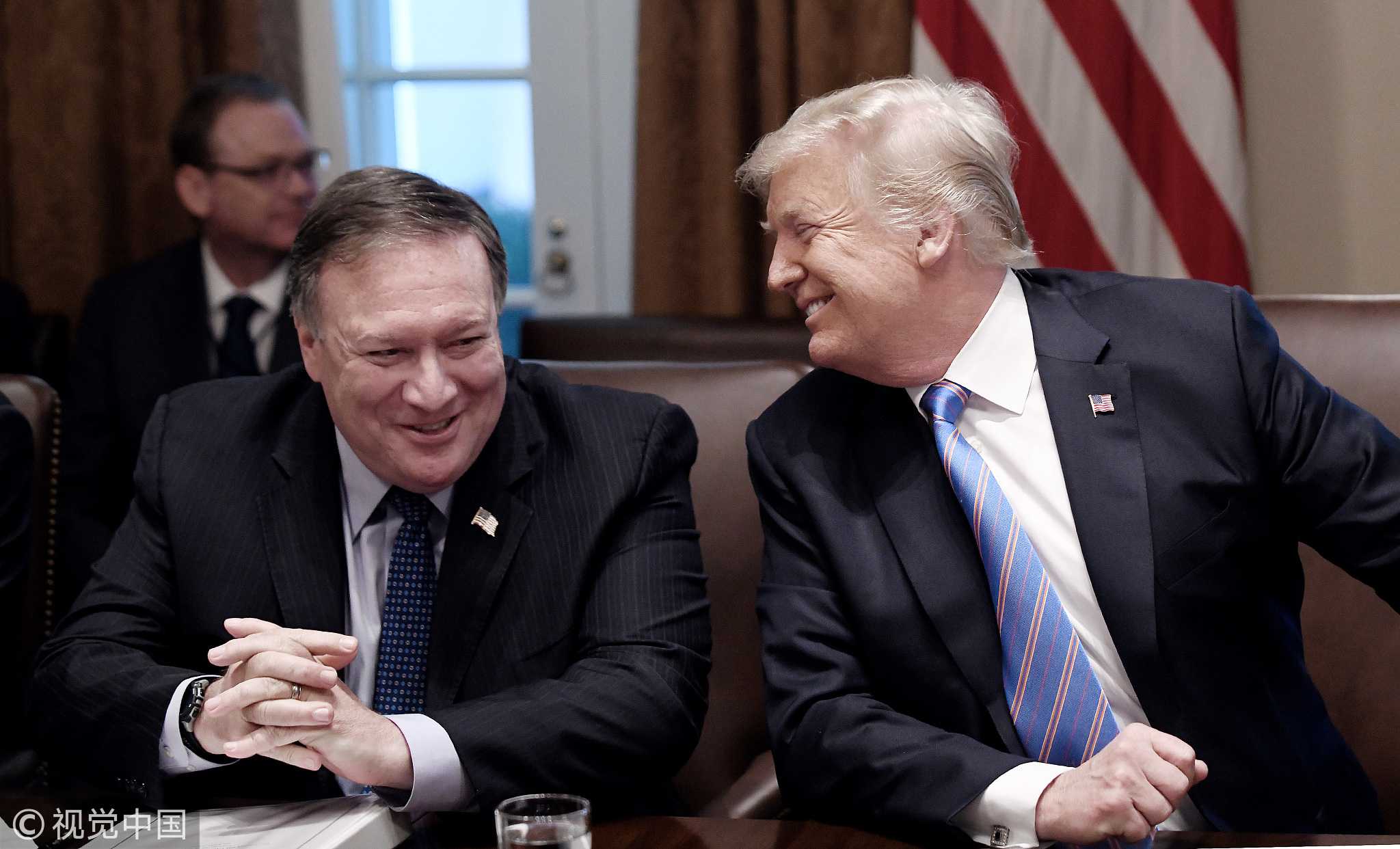 US President Donald Trump (R) and Mike Pompeo, US secretary of state, laugh during a meeting at the White House in Washington, DC, US, July 18, 2018. /VCG Photo