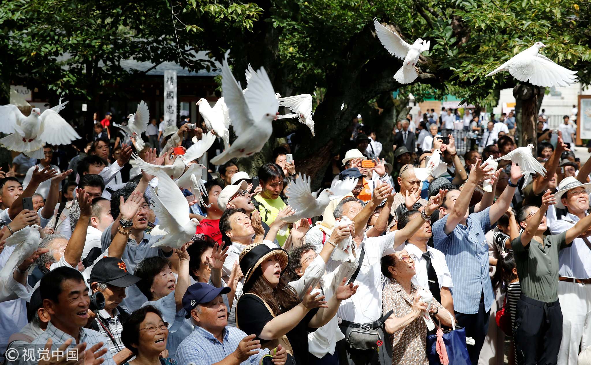 People release doves as a symbol of peace at the Yasukuni Shrine for the war dead in Tokyo, Japan, August 15, 2018. /VCG Photo