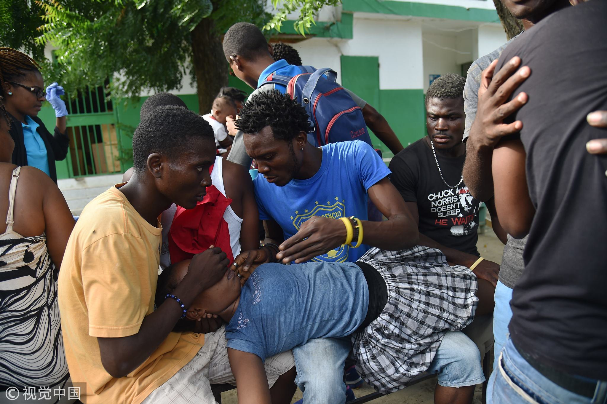 An injured person arrives in the yard of the Immaculate Conception Hospital in the city of Port-de-Paix, October 7, 2018. /VCG Photo