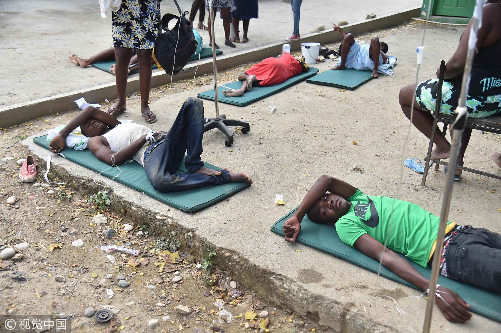 Patients are treated in the yard of the Immaculate Conception Hospital in the city of Port-de-Paix following the earthquake, October 7, 2018. /VCG Photo