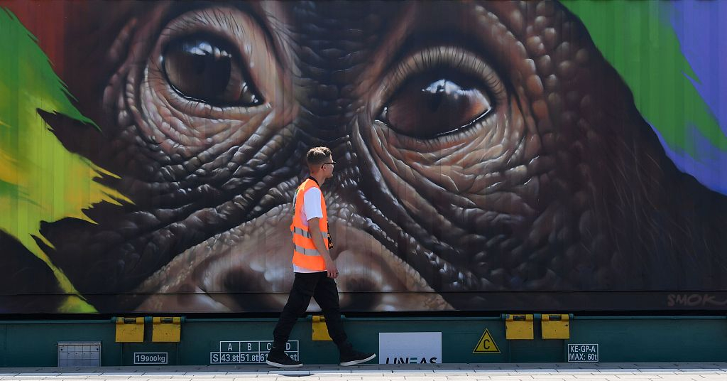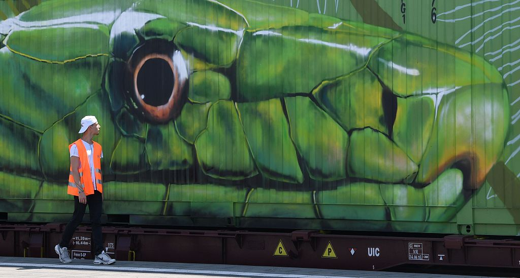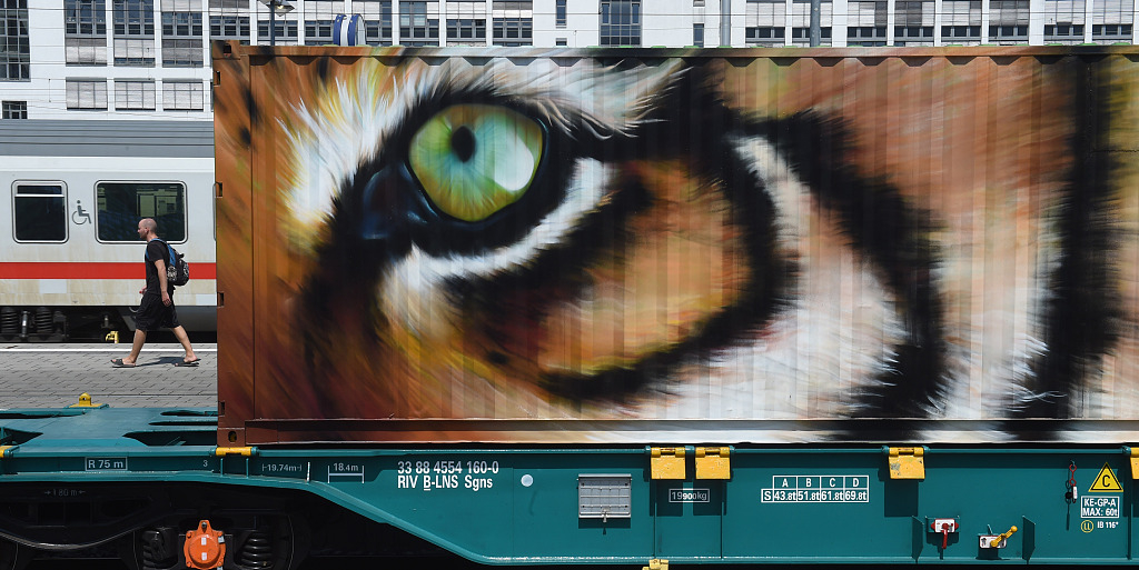 Designed by Belgian street art artists, a freight train featuring endangered animals stops in Munich, Germany on Tuesday. /VCG Photo