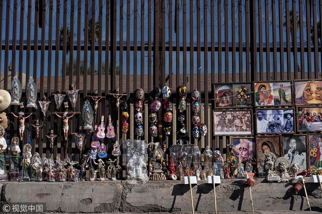 Merchandise is displayed for sale on the U.S.-Mexico Border fence, in Mexicali, Baja California state, Mexico, April 5, 2019. /VCG Photo