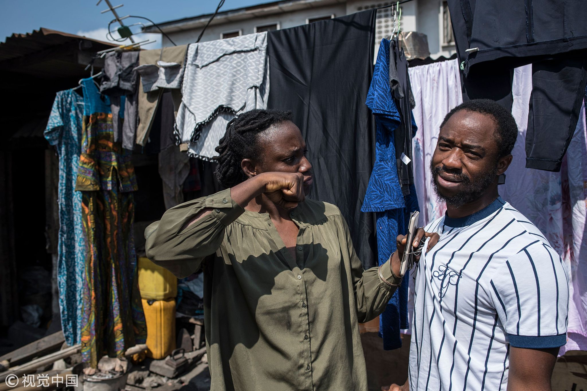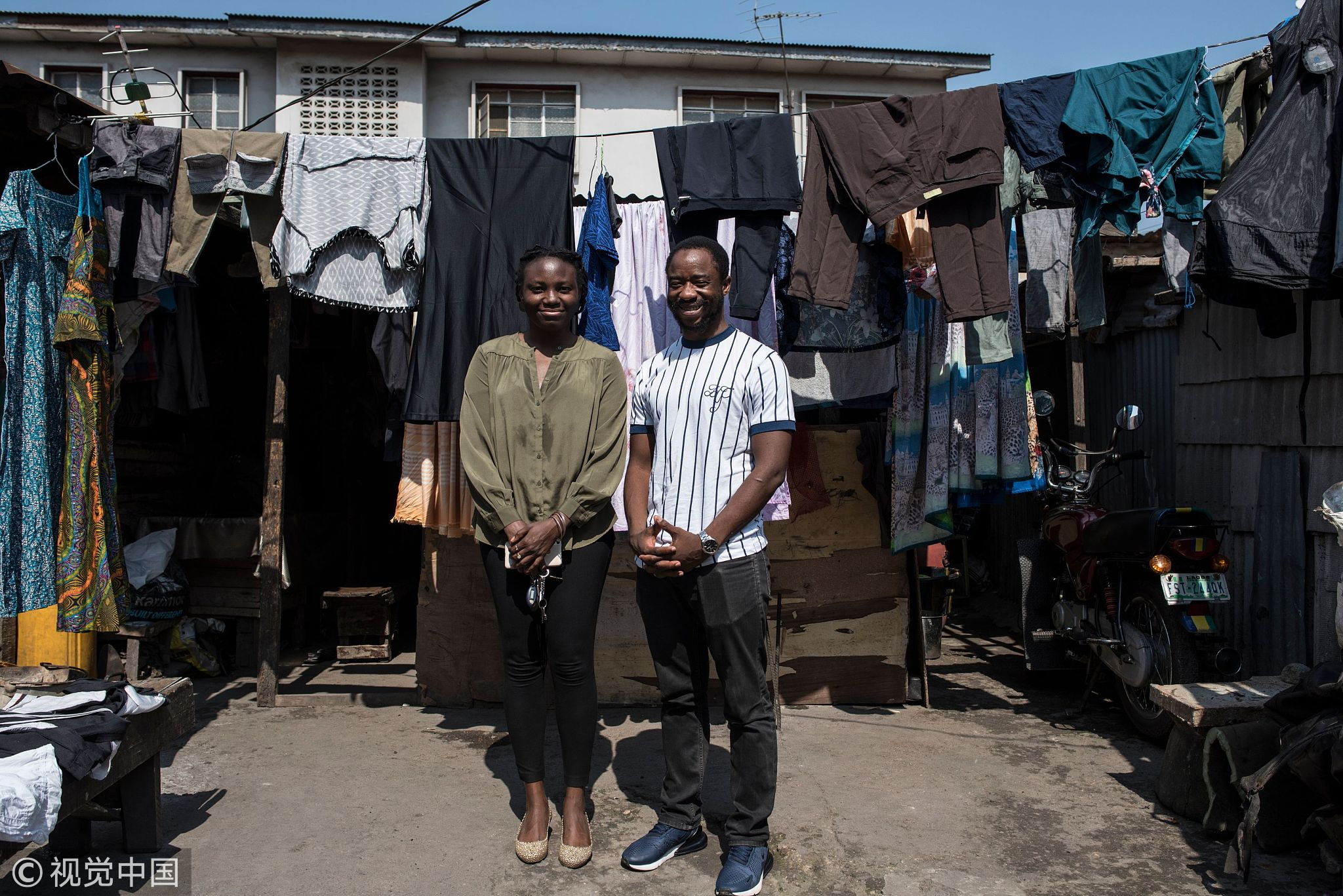 Nigerian film director of the Nollywood film "Kasala" Ema Edosio (L) and Nigerian actor Abiodun Kassim, pose in the Oju Elegba neighbourhood where the film was shot on June 11, 2018, in Lagos. /VCG Photo