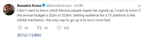 "I don't want to know which famous people Apple has signed up. I want to know if the annual budget is 1bn or 10bn U.S. dollars," tweeted Benedict Evans, a Silicon Valley investor and blogger.