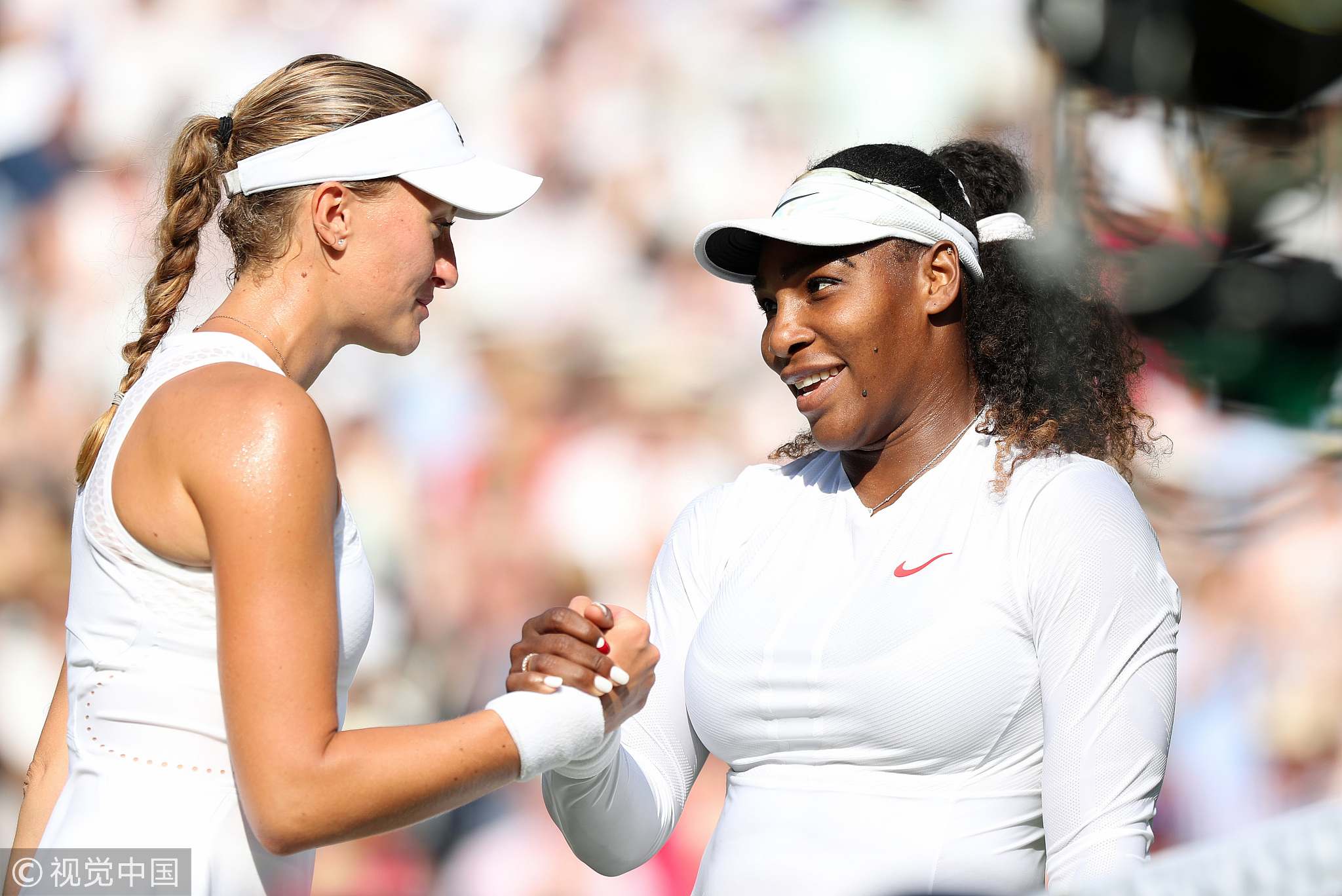 Serena Williams of the United States consoles Kristina Mladenovic of France during the Wimbledon Lawn Tennis Championships, July 6, 2018, in London, England. /VCG Photo