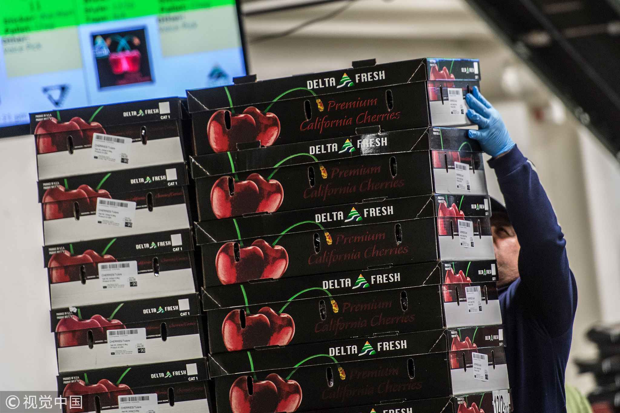 A worker stacks boxes of cherries to be shipped out at the Delta Packing Co. of Lodi Inc. in Lodi, California, U.S., on Tuesday, May 29, 2018./VCG Photo