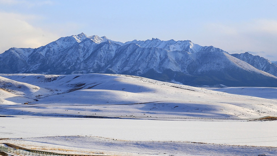 The sky is fresh and clear above Shandan Horse Farm Grassland in northwest China's Gansu Province following a long-awaited spring snow on April 8. Located on the north slope of Qilian Mountain, the farm and the surrounding grassland is covered by white snow and the air is particularly fresh.