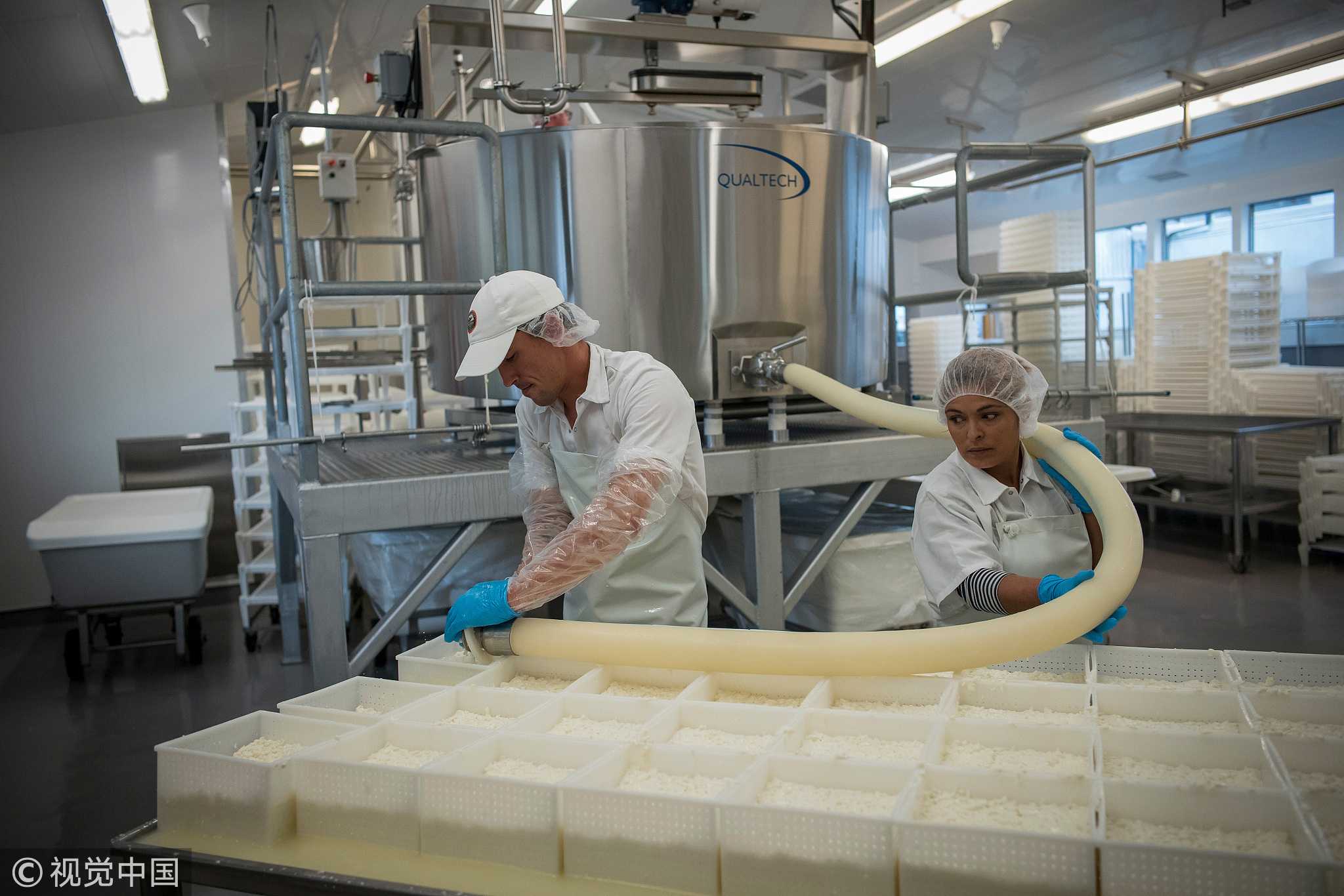Employees fill molds with milk curds and whey at the Nicasio Valley Cheese Co. facility in Nicasio, California, US, on Jul 6, 2018./VCG Photo