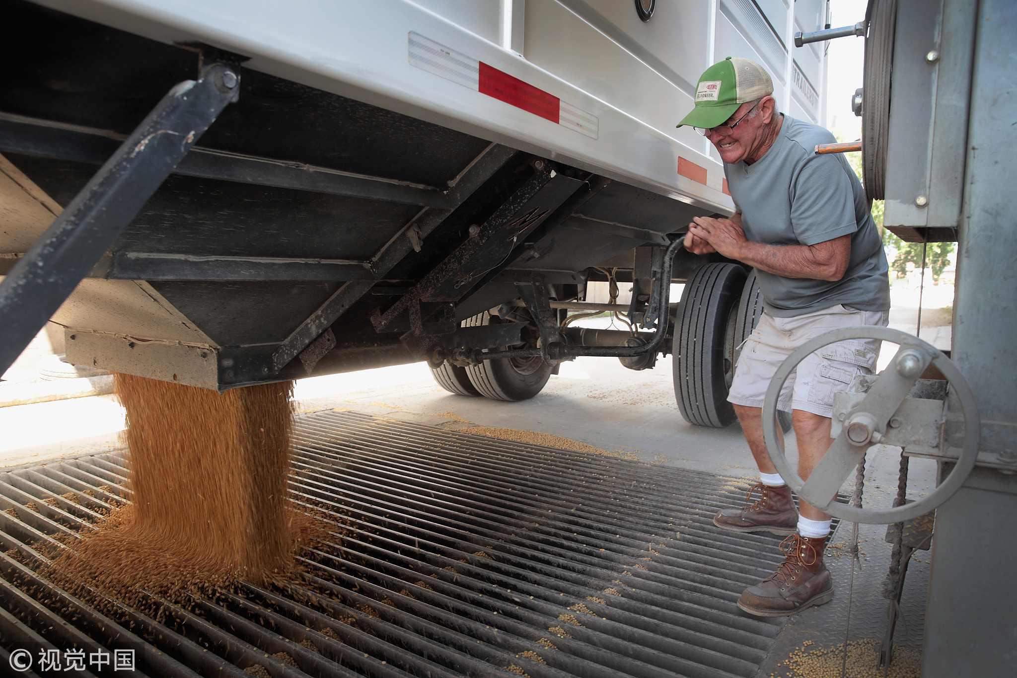 An American farmer unloads soybeans at a grain elevator in Blackstone, Illinois, US, on Jun 13, 2018./VCG Photo