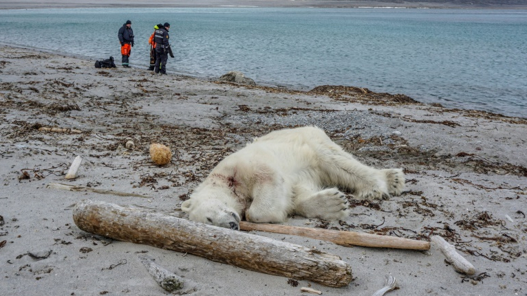 (Top image: A polar bear lies dead after being gunned down following an attack on a cruise ship employee on Norway's Spitzbergen island. /AFP Photo)