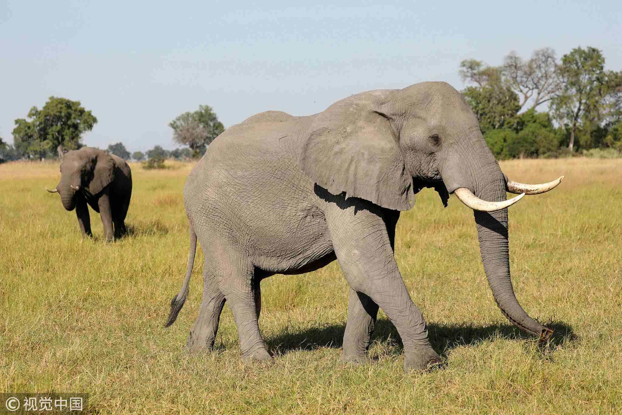 A pair of male elephants in the Okavango Delta, Botswana, April 25, 2018. /VCG Photo