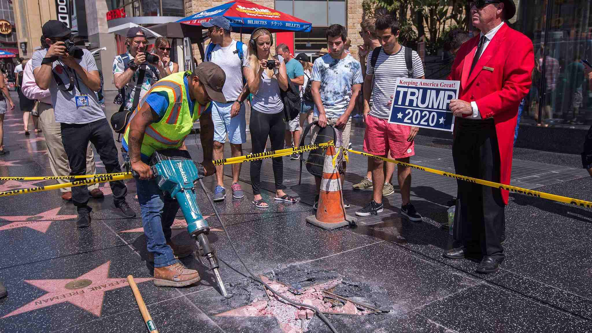 US President Donald Trump’s star on the Hollywood Walk of Fame was destroyed by a vandal with a pick axe on Wednesday. It was the second time in less than two years that the star was vandalized. /VCG Photo