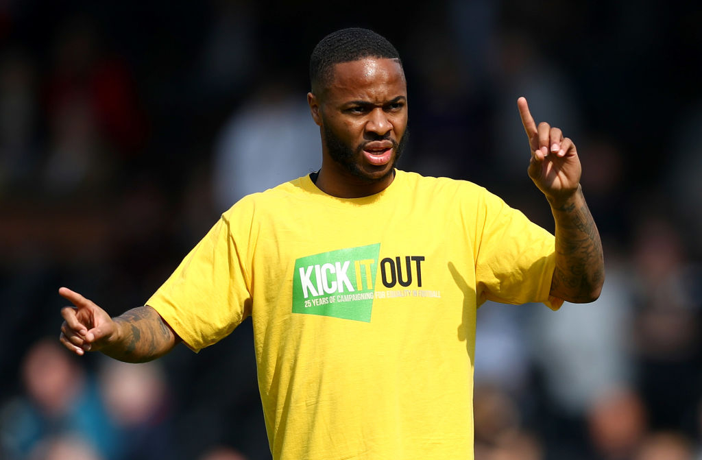 Raheem Sterling of Manchester City warms up while wearing a "Kick It Out – 25 years of campaigning for equality in football" anti-racism shirt ahead of his team's Premier League match against Fulham at Craven Cottage in London, UK, March 30, 2019. /VCG Photo