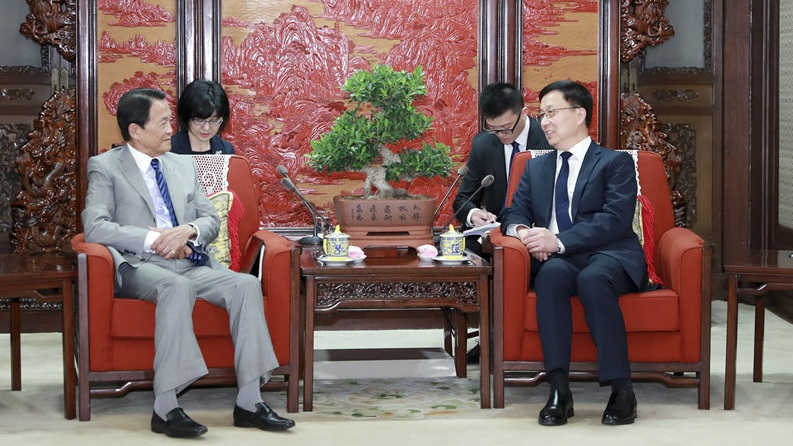 Shortly after the meeting with Han, Aso met with Chinese finance minister Liu Kun at the seventh China-Japan Finance Ministers' Dialogue and both sides agreed the two countries will oppose trade protection and unilateralism, and will give more roles to multilateral platforms such as G20 and World Bank, one year after such a meeting in Japan's Yokohama.