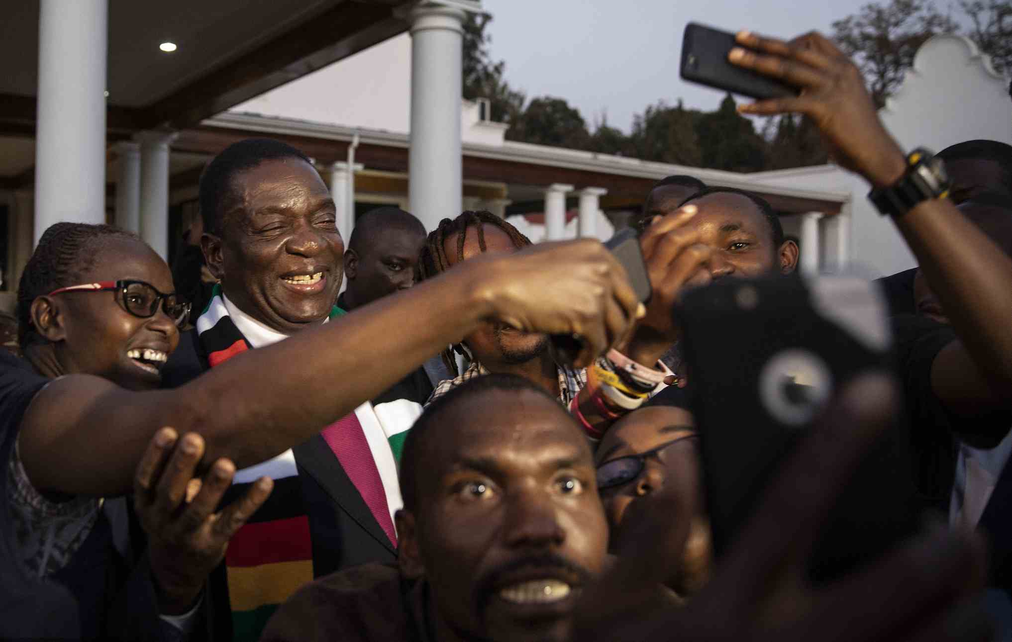 President-elect Emmerson Mnangagwa steps onto the lawn to pose for photographs and selfies after attending a press conference in Harare, August 3, 2018. /VCG Photo
