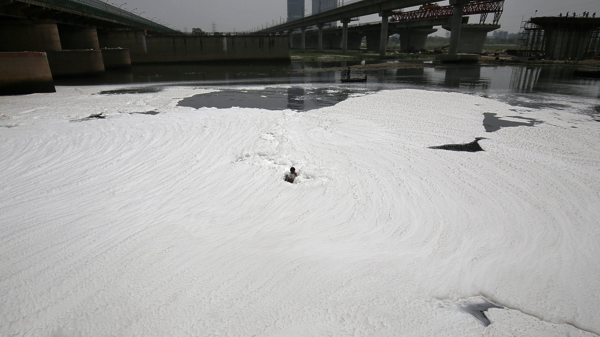 A man swims as he collects recyclable items in the polluted water of the river Yamuna ahead of World Environment Day, in New Delhi, India, June 4, 2018. /VCG Photo