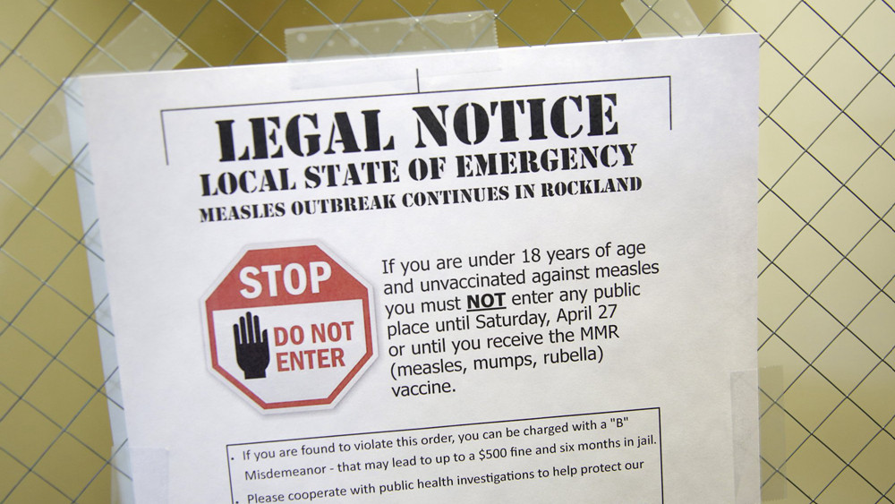 (Cover: A sign explaining the local state of emergency is displayed at the Rockland County Health Department in Pomona, New York, March 27, 2019. /AP Photo)