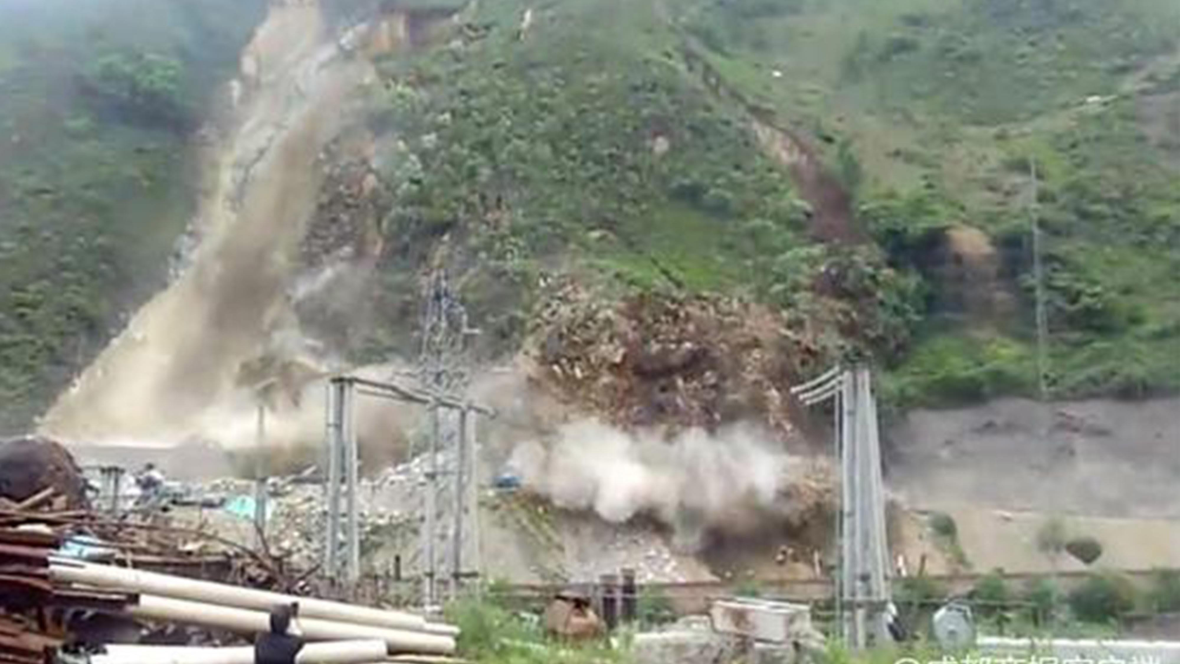 About 50,000 cubic meters of mud fell onto a road, blocking access to traffic, in a massive landslide in southwest China's Sichuan Province on Saturday afternoon. No casualties were reported.