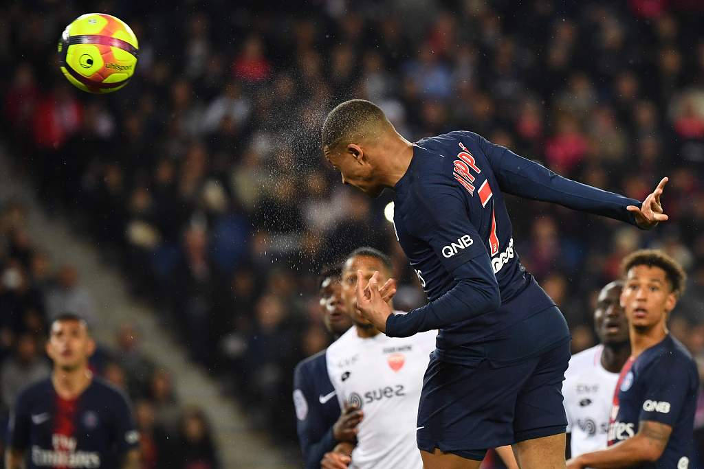 Kylian Mbappe (C) of PSG heads the ball during the French Ligue 1 match which PSG had a 4-0 win over Dijon at the Parc des Princes stadium in Paris, France, May 18, 2019. /VCG Photo