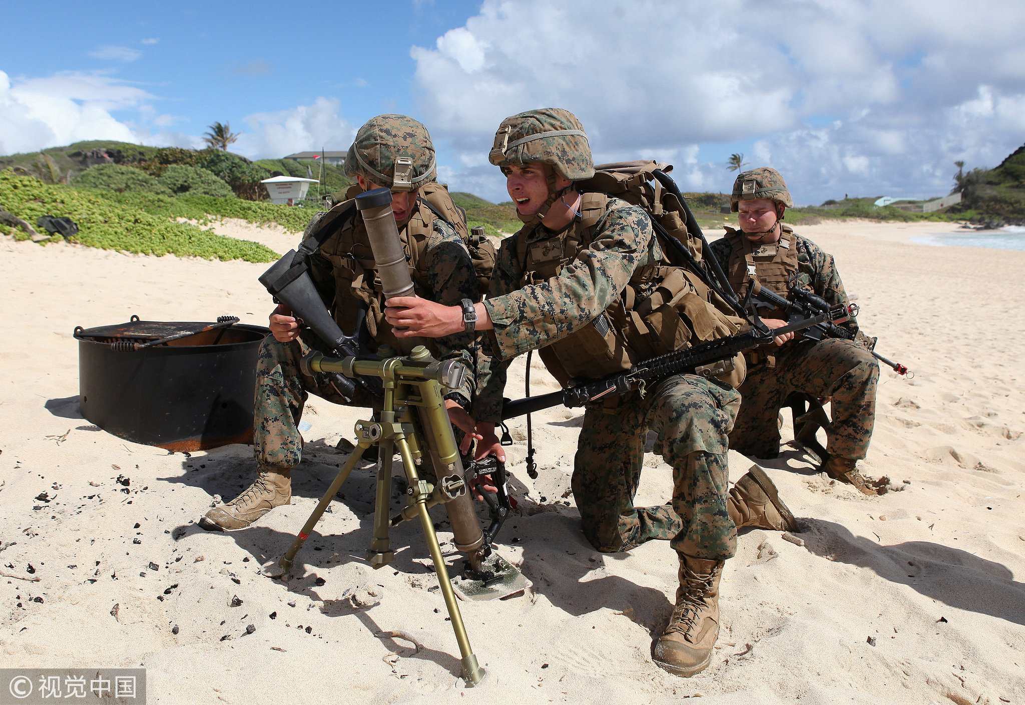 US Marines set up a mortar defense during a simulated beach assault at Marine Corps Base Hawaii with the 3rd Marine Expeditionary Unit during the multi-national military exercise RIMPAC in Kaneohe, Hawaii, July 30, 2016. /VCG Photo.