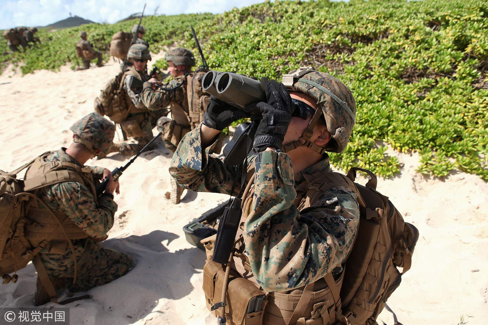 A US Marine checks GPS coordinates for his mortar team during a simulated beach assault at Marine Corps Base Hawaii with the 3rd Marine Expeditionary Unit during the multi-national military exercise RIMPAC in Kaneohe, Hawaii, July 30, 2016. /VCG Photo.