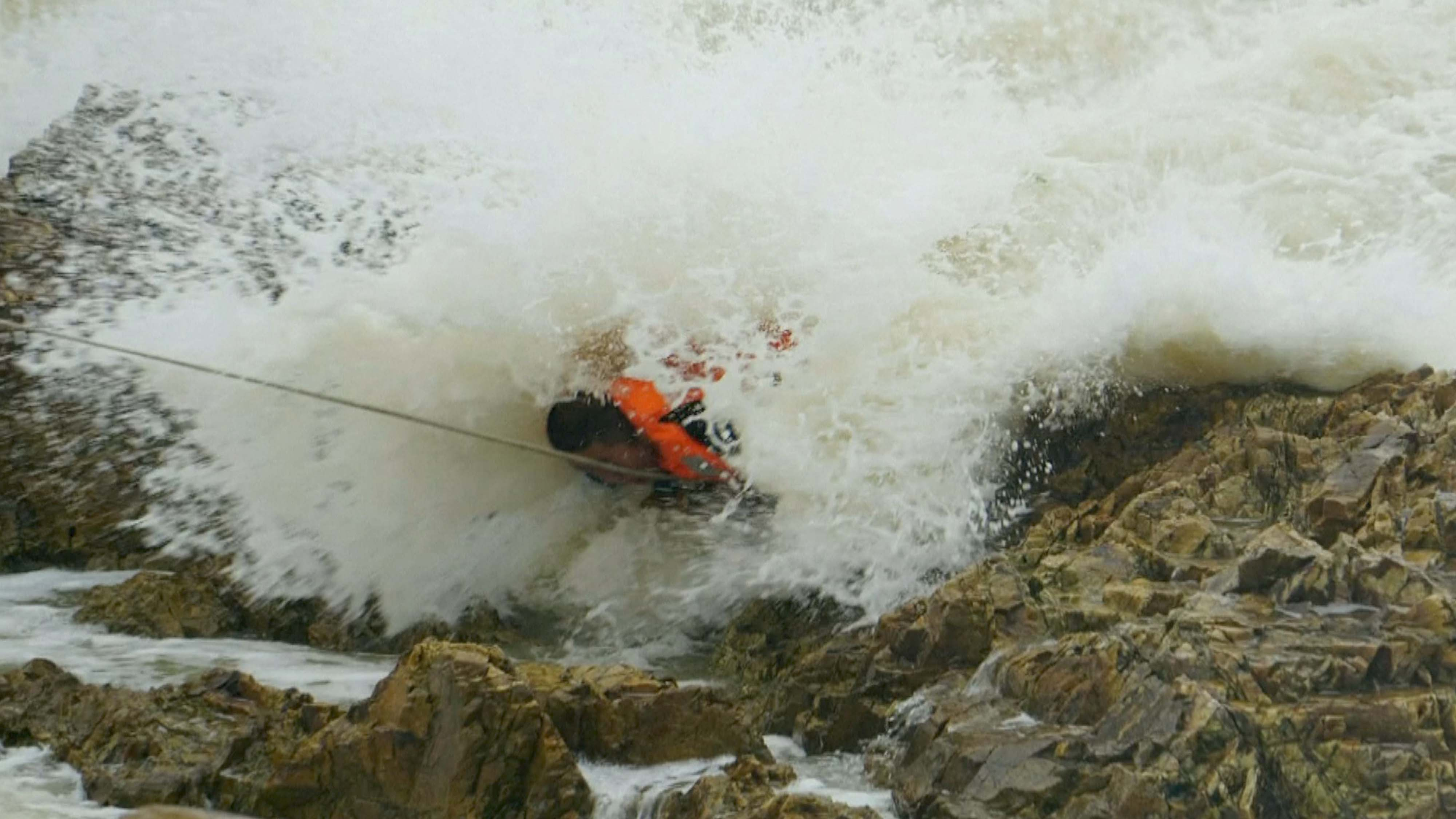 A man going sea fishing was found trapped between giant rocks during high tide in Dalian City of northeast China’s Liaoning Province on Friday. Through joint efforts by some a dozen people, he was eventually brought to safety.
