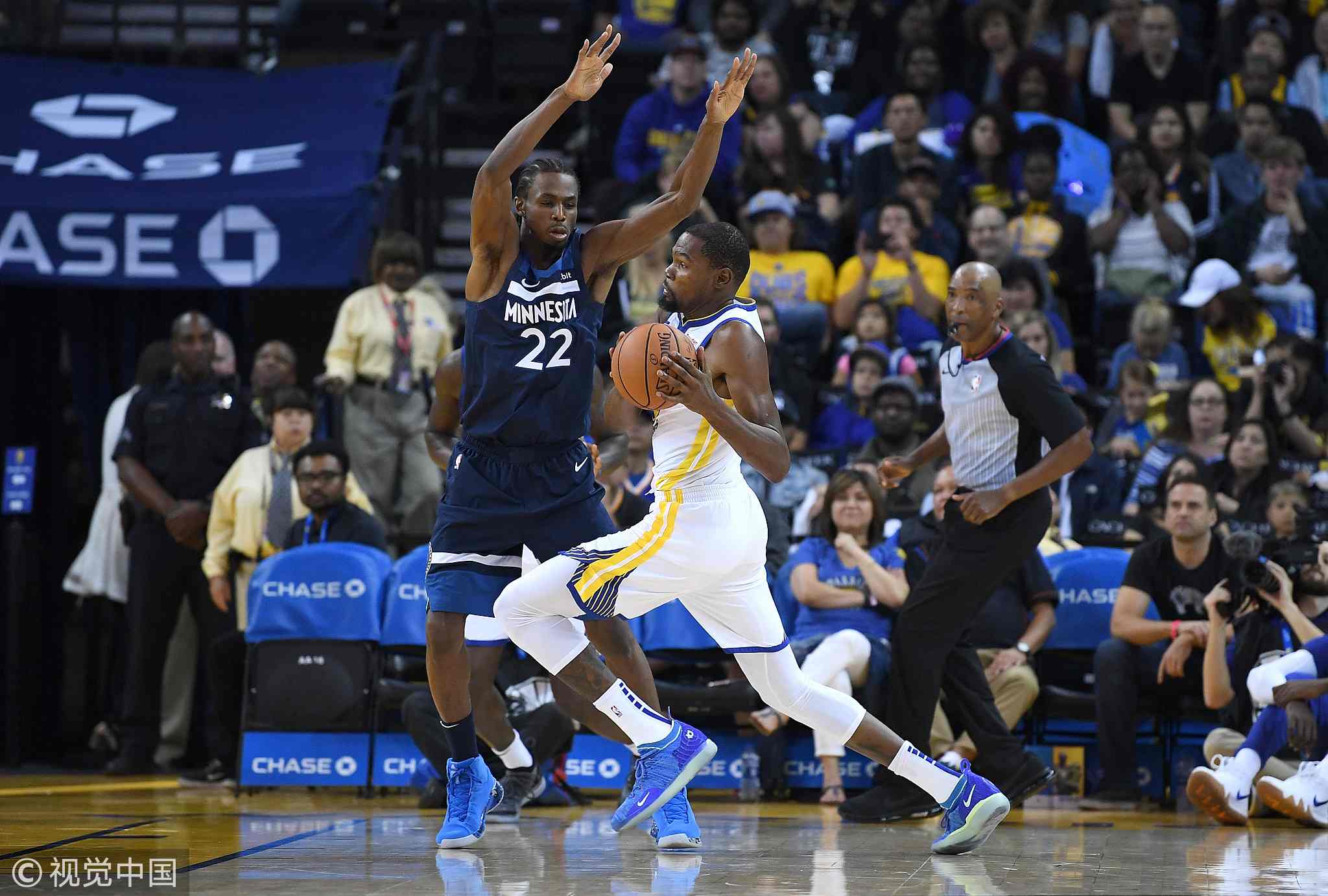 Kevin Durant #35 of the Golden State Warriors drives on Andrew Wiggins #22 of the Minnesota Timberwolves during an NBA basketball game at ORACLE Arena in Oakland, California, September 29, 2018. /VCG Photo