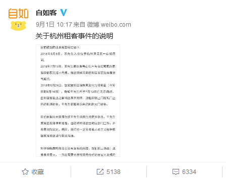 On Sunday, Ziroom posted a statement on Weibo pledging to actively cooperate with the judiciary and respect the court's ruling in the lawsuit. And the company will suspend all rental services from September 1 until it receives health clearance for its rooms.