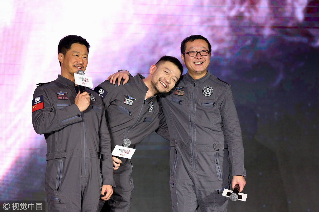 Actor Wu Jing (L), film director Guo Fan (C) and sci-fi novelist Liu Cixin at a promotional event of "The Wandering Earth". /VCG Photo